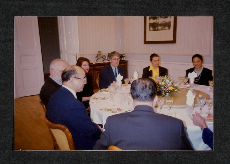 Abgebildet sind: Botschafter Wang Yanyi, Prof. Wu, Peking, Prof. Reuter, Deutschland, Karl Holubar, Wien, und teilweise die Ehefrauen der Abgebildeten.