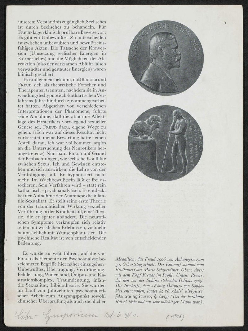 Das Medaillon ist von Carl Maria Schwerdtner angefertigt worden. Avers: Porträt von Sigmund Freud; Revers: der vor der Sphinx stehende Ödipus. Fotografie in einem Artikel im Ciba-Symposium, Bd. 4, Heft 1, 1956. Entwurf von Carl Maria Schwerdtner aus dem Jahr 1906.