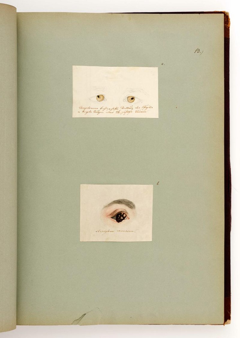 Die Zeichnungen wurden von Georg Joseph Beer angefertigt. Die obere Zeichnung zeigt eine angeborene Fehlstellung der Augen. Die Untere Zeichnung zeigt ein Staphyloma Racemosum. Digitalisate des Albums: Reiner Riedler.